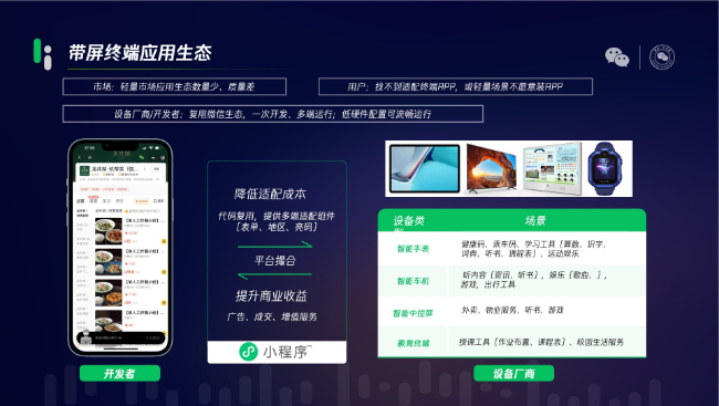 随着物联网、IoT的进一步发展,“万物互联”的愿景逐渐成为现实。但在实际发展中,物联网也遇到不少难题,比如要下载单独APP,配网和控制流程较为复杂等。小程序IoT团队,则致力于解决这些问题。现在,一套代码可运行在多种带屏终端上的方案,在车机、音箱、手表等领域有很大的拓展空间,而硬件直接拨打至微信的体验,也极大提升了通话触达率。
