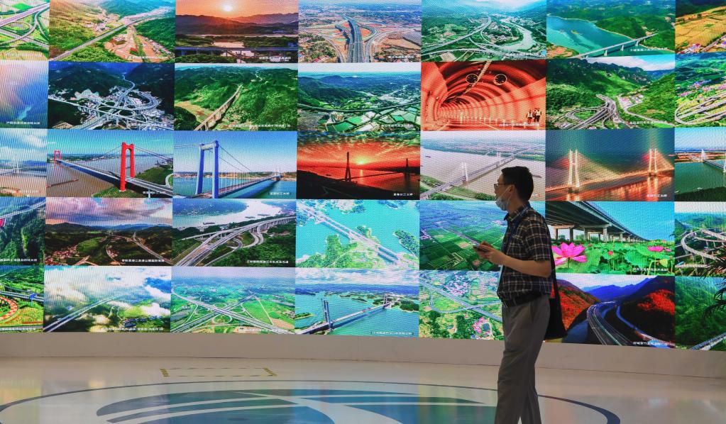 6月14日,在2023世界交通运输大会,观众在观看交通成就展示墙。新华社记者 程敏 摄