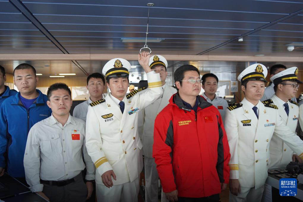 这是抵达北极点瞬间,“雪龙2”号极地科考破冰船船长肖志民拉响汽笛(9月5日摄)。