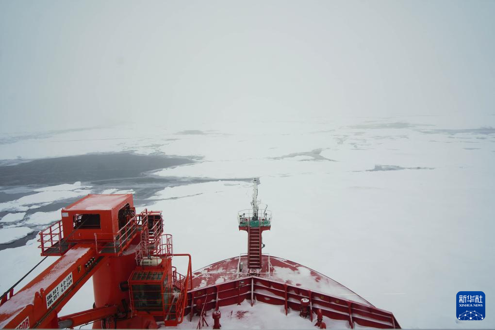 这是抵达北极点瞬间,“雪龙2”号极地科考破冰船前方的浮冰(9月5日摄)。