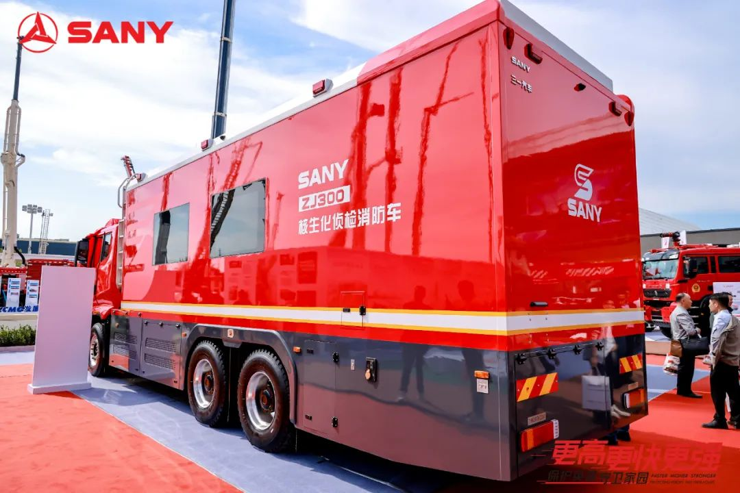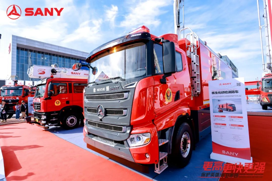展会首日,三一核生化侦检消防车与PW04多功能高压喷雾消防车发布。
