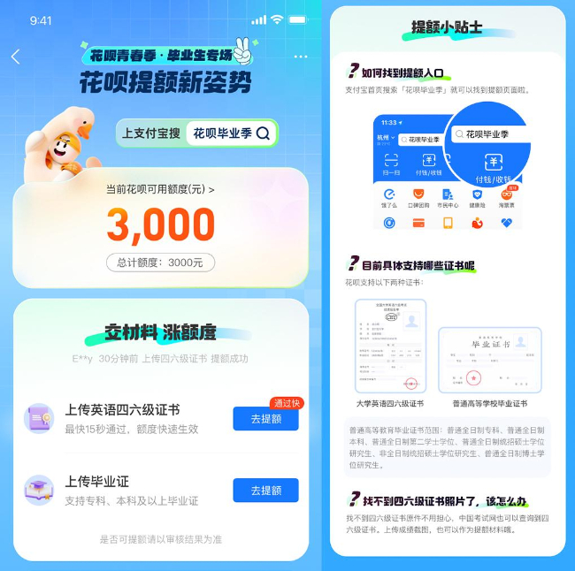 根据产品页面介绍,对已开放测试的毕业生,上支付宝搜“花呗毕业季”可尝试自主申请提额,目前支持上传的证书有两种:专科、本科及以上的普通高等教育毕业证书,和大学英语四六级通过的证书。上传的证书经审核通过后,可展示相应的提额结果。