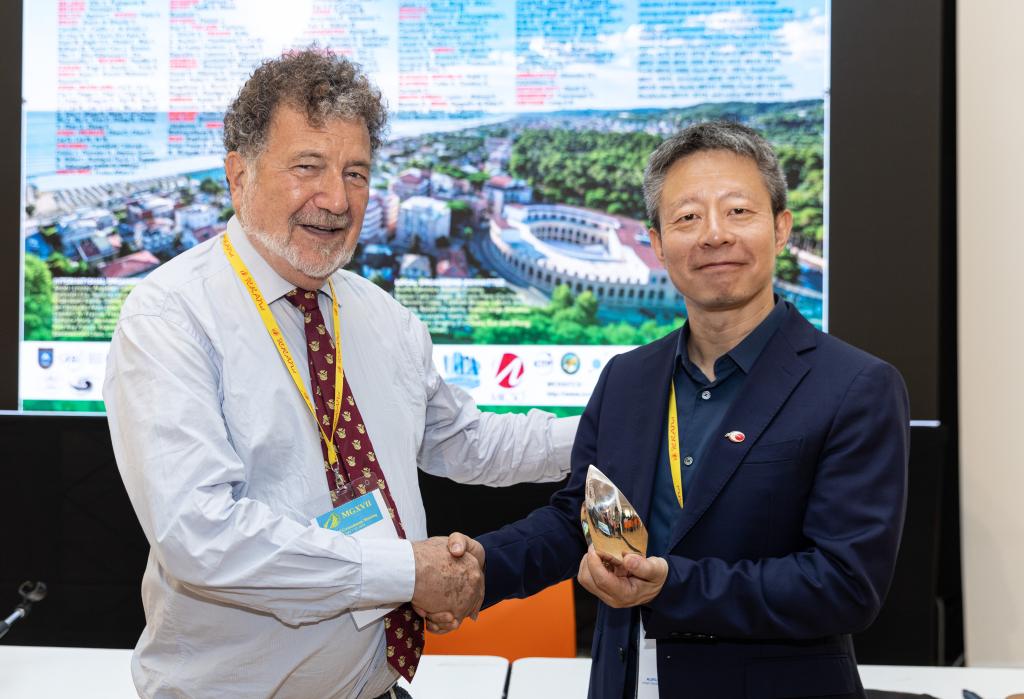 2024年7月9日,在意大利佩斯卡拉,会议主办方之一、国际相对论天体物理中心网络主任雷莫·鲁菲尼(左)为李菂颁奖。新华社记者 李京 摄
