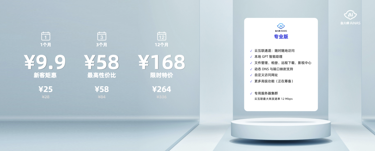 新品首发期间,为了让更多用户体验到鲁大师 AiNAS的完整服务,即日起首发新用户可以享受鲁大师 AiNAS“专业版”首月9块9、年卡168元的特惠价格。
