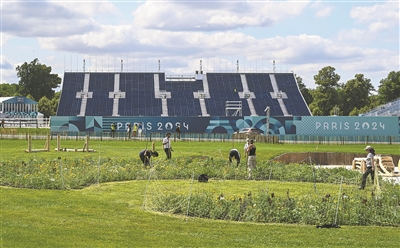7月17日,工作人员在2024年巴黎奥运会马术赛场布置场内景观。