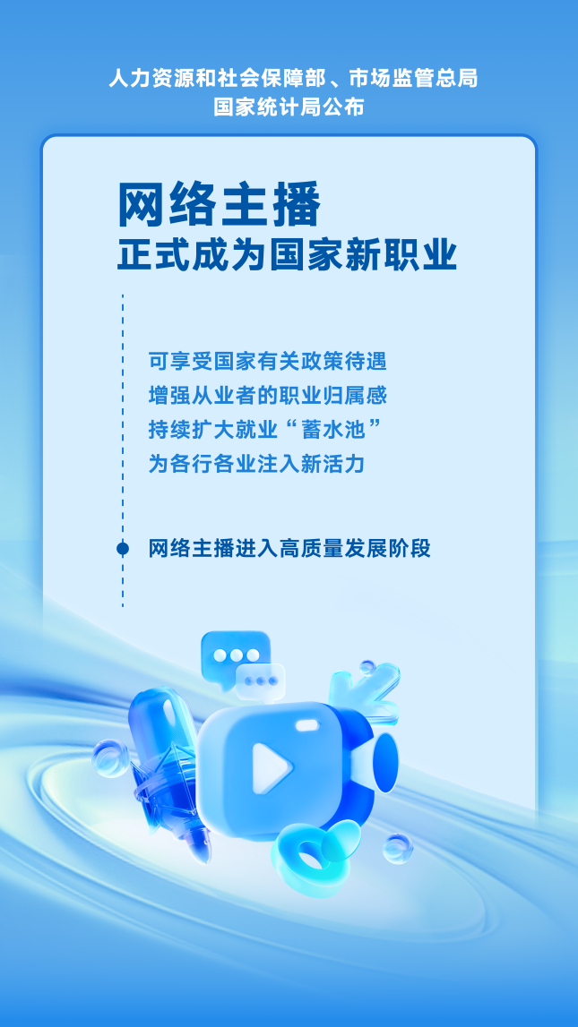 7月31日,人力资源和社会保障部会同国家市场监督管理总局、国家统计局正式增设网络主播为国家新职业,这标志着网络主播的职业身份在“国家确定职业分类”上首次得以确立。人社部此前印发的《关于加强新职业培训工作的通知》指出,新职业从业者可以享受国家职业技能培训补贴和职业技能鉴定补贴等有关政策待遇,以及高技能人才与专业技术人才职业发展相关政策。