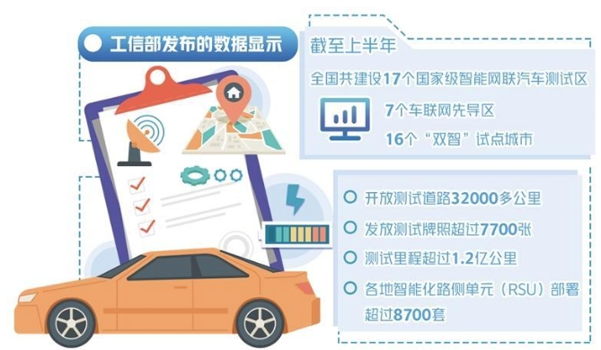 工信部发布的数据显示,截至上半年,全国共建设17个国家级智能网联汽车测试区、7个车联网先导区、16个“双智”试点城市,开放测试道路32000多公里,发放测试牌照超过7700张,测试里程超过1.2亿公里,各地智能化路侧单元(RSU)部署超过8700套。