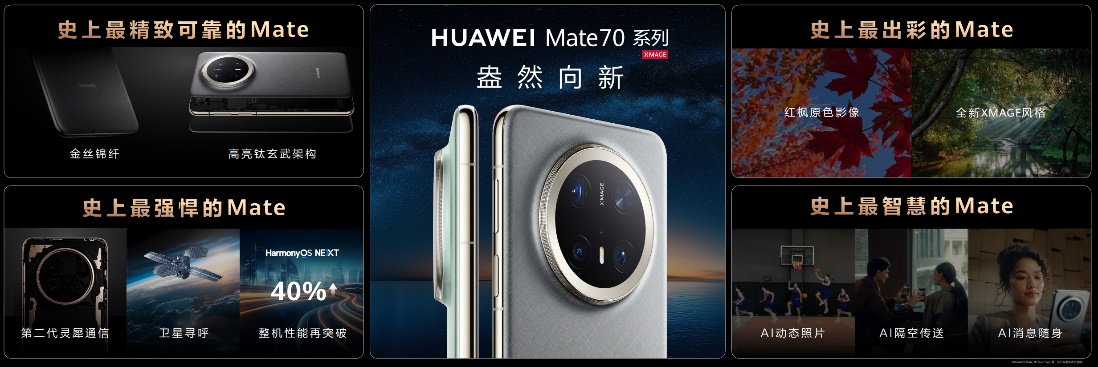 华为常务董事、终端BG董事长、智能汽车解决方案BU董事长余承东表示:“Mate系列始终坚持探索创新科技与极致体验,十二年来与消费者携手并肩,一路向前,已经成为亿万用户的可靠伙伴。随着AI技术的突破,Mate 70系列继续进化、盎然向新,把前沿科技和创新体验带给每一位消费者。”
