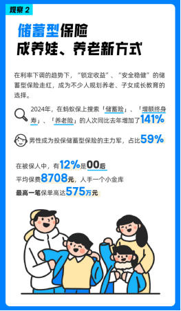 蚂蚁保的《年度观察》显示,2024年,在平台上搜索“储蓄险”、“增额终身寿”、“养老险”的人次同比去年增加了141%。在投保储蓄型保险的用户中,男性用户明显多于女性,占比59%,成为投保储蓄型保险的主力军。