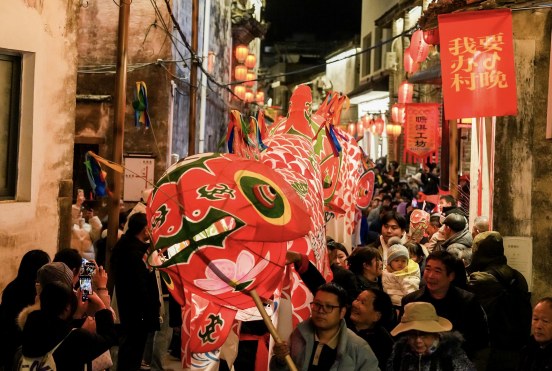 村民和游客被“村晚”吸引,加入嬉鱼灯队伍