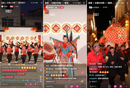 新春将近,1月8日-10日,安徽、福建、湖南三地乡村上演 3 场由才艺主播发起的“村晚”,瞻淇鱼灯、提线木偶、苗族歌舞等民俗登上直播间,吸引超572.7万网友线上迎新春。