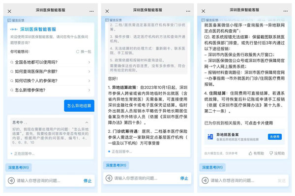 深圳医保全新升级的智能客服搭载了最新AI大模型,用户可以自由选择擅长推理的DeepSeek,或者可以多维度理解问题的腾讯混元,无论是咨询"生育津贴怎么算"这类复杂政策,还是询问"门诊特定病种如何认定"等专业问题,都能结合具体参保情况,给出精准到位的解答。