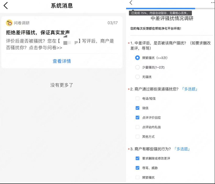 因为写下差评被商户“花式骚扰”,则是当下影响消费体验另一大“重灾区”,不少消费者因此不再敢对商户“说真话”。上述负责人表示,虽然大众点评对商户在站内信渠道的差评骚扰有拦截,但还是有作者在恳谈会上提到,仍有商家通过三方扫码点餐系统等渠道获取用户信息,通过短信、电话等站外渠道进行骚扰。