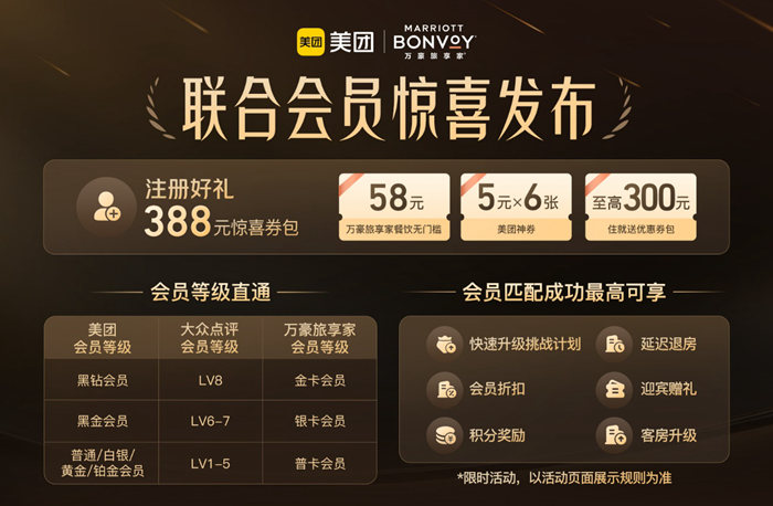 本次合作,双方将发布联合会员。美团、大众点评用户在平台内注册万豪酒店新会员,可根据平台内的会员等级匹配相应等级的万豪旅享家会员,如美团黑钻或大众点评LV8会员将直接成为万豪金卡会员,新会员在美团和大众点评App预订酒店可享受限时会员升级挑战,挑战期间可体验包括万豪旅享家会员挑战价、入住房间数累积、积分累积等万豪旅享家会员同等权益。