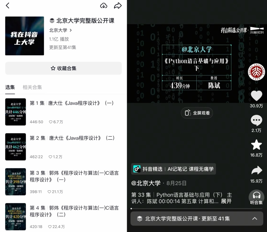 据抖音精选公开课最新公开数据显示,清北复交等30多所高校的课程,覆盖计算机、人工智能等前沿学科,共计上线了200多门公开课。其中最受欢迎50门课程的总播放量近2亿,平均每门课程有超过370w人观看。北京大学发布的《实用python程序设计》时长超过21小时,播放量超过 4000万,获得了网友和高校的认可。一系列亮眼数据清晰表明,当顶尖高校的 AI 教育资源与短视频平台的传播优势深度融合,不仅实现了优质高等教育资源的“破圈”传播,更标志着 AI 知识普及正式迈入 “全民可学、全民易学” 的新阶段,为行业探索知识普惠新模式提供了极具价值的实践范本。