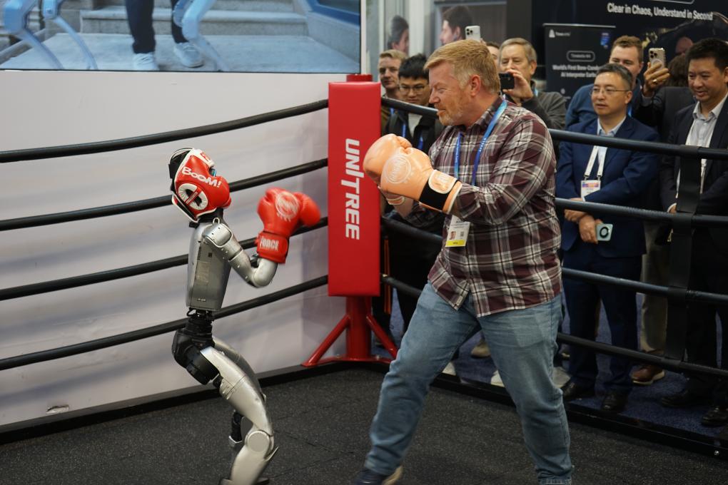 2026年1月8日,在美国拉斯维加斯消费电子展上,参观者与宇树机器人互动。新华社发(曾慧摄)