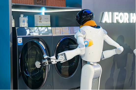 在洗护场景中,它能像真人一样打开洗衣机或烘干机,把衣服拿出来晾晒整理,未来通过持续学习,还能实现熨衣、挂衣、叠衣,把人们从日复一日的洗晒中彻底解放。