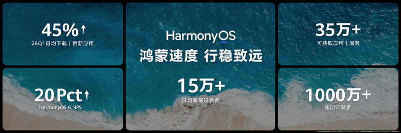 自去年10月份发布以来,HarmonyOS 6已成为应用创新的“首选土壤”。众多伙伴争相首发独家功能,助推生态体验从“可用”加速迈向“好用”。截至目前,搭载HarmonyOS 5及HarmonyOS 6的终端设备数突破5000万,日均新增设备数超15万,26年1季度用户日均下载/更新应用数环比提升45%,HarmonyOS 6的NPS值相比于HarmonyOS 5提升20个PCT,超35万应用及服务可供用户随时下载使用,鸿蒙注册开发者超1000万。“设备增长+伙伴共创+人才发展”的飞轮效应已然形成,鸿蒙生态正式开启规模化发展的黄金周期。