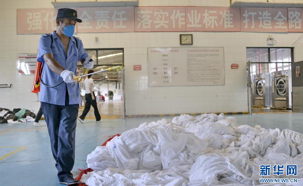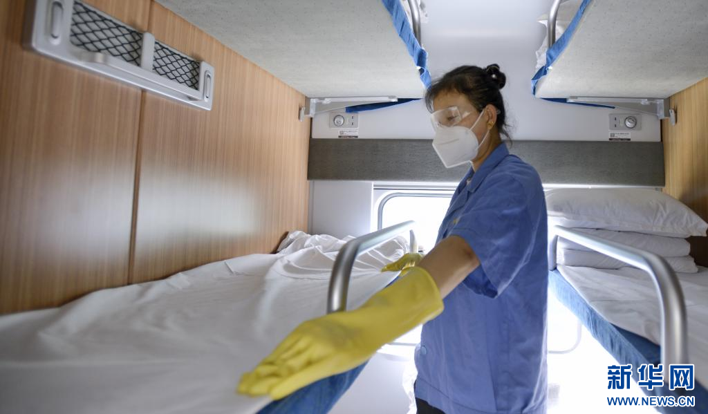 8月23日,北京客运段的保洁人员在给列车换上经过消毒灭菌洗涤后的卧具。 中国铁路北京局集团有限公司北京客运段为保障旅客出行安全,加强列车卧具、窗帘、台布洗涤过程中的防疫消毒工作,北京客运段洗涤车间的所有洗涤物品都要经过洗涤前消毒、高温洗涤、灭菌洗涤和高温熨烫四道消杀灭菌工序,保障铁路出行安全。 新华社记者 李欣 摄pagebreak