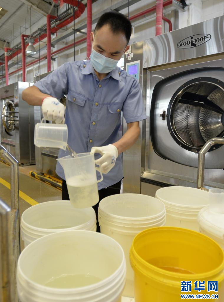 8月23日,北京客运段洗涤车间的工作人员在进行二次消毒洗涤前的准备工作。 中国铁路北京局集团有限公司北京客运段为保障旅客出行安全,加强列车卧具、窗帘、台布洗涤过程中的防疫消毒工作,北京客运段洗涤车间的所有洗涤物品都要经过洗涤前消毒、高温洗涤、灭菌洗涤和高温熨烫四道消杀灭菌工序,保障铁路出行安全。 新华社记者 李欣 摄