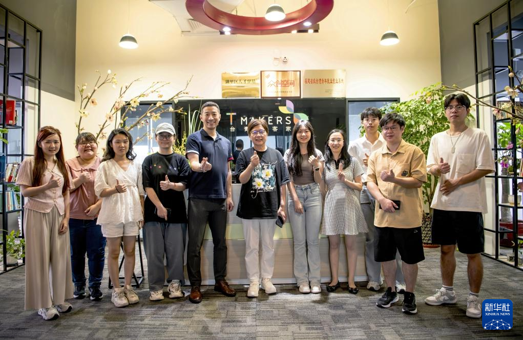 厦门“台青创客家”负责人虞慧芳(中)和她的部分团队成员合影(6月14日摄)。