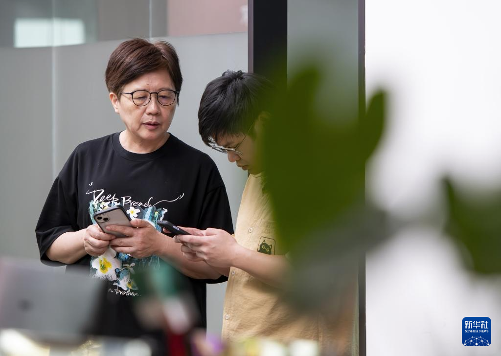 厦门“台青创客家”负责人虞慧芳(左)与团队成员沟通交流(6月14日摄)。