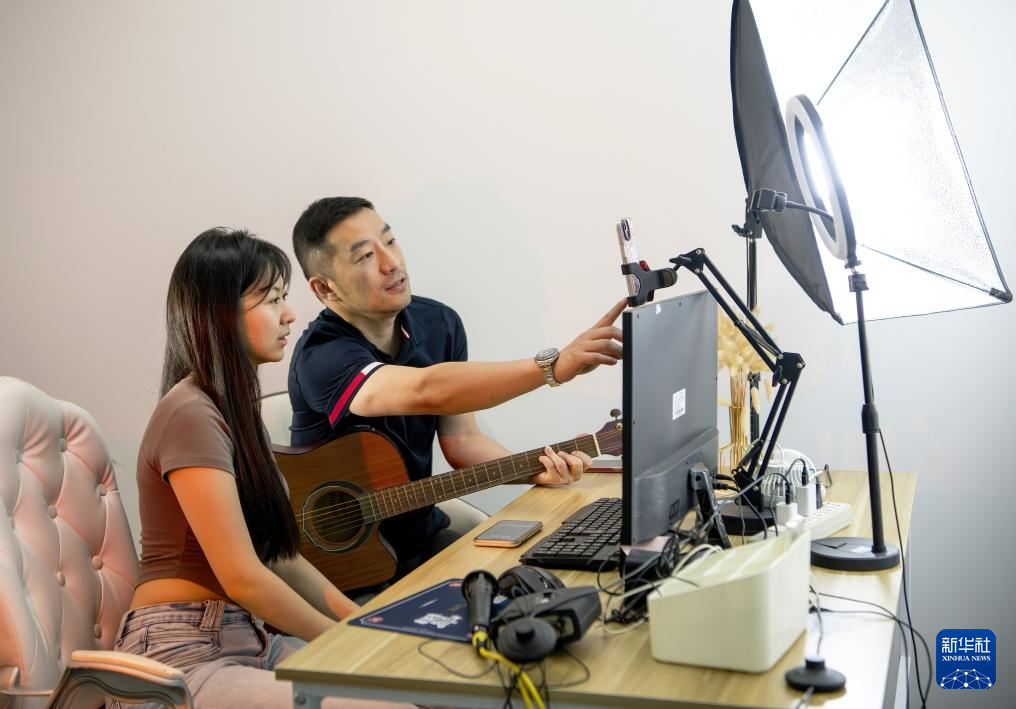 集美大学毕业的台青李佳勋(左)在厦门“台青创客家”直播间里学习电商直播带货(6月14日摄)。