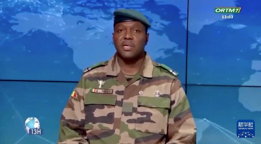 1月28日,马里过渡政府发言人阿卜杜拉耶·马伊加在国家电视台宣读联合公报(视频截图)。西非国家马里、尼日尔、布基纳法索28日发布联合公报,宣布立即退出西非国家经济共同体(西共体)。新华社发