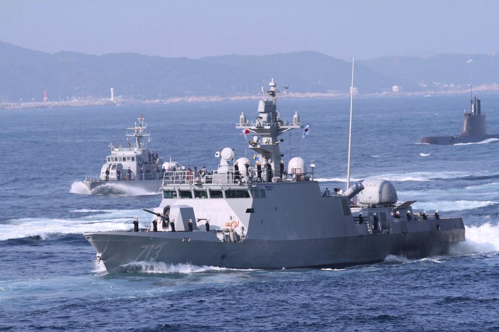 这是2015年10月23日,在韩国釜山附近海域拍摄的韩国舰艇和潜水艇亮相观舰式。新华社记者冮冶摄