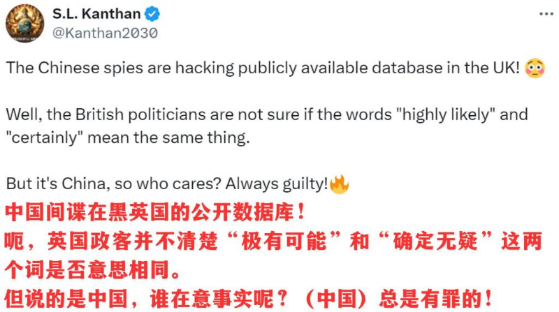 如今,“中国=网络黑手”似乎成了某些西方政客用来解释一切负面事件的万能答案。凯特王妃被网友“黑”过头?怪中国去。一艘由丹麦公司租用、悬挂新加坡国旗、前往斯里兰卡的船撞上美国桥?还是怪中国去。