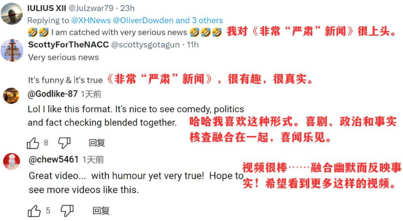 脱口秀播发后,英国议会议员乔治·加洛韦、伦敦广播公司主持人丹尼丝·黑德利、伦敦都市大学副教授康斯坦丁诺斯·皮塔基、美国反战组织“粉色代码”等机构和个人账号纷纷转赞评。网友们在评论区呼吁:这样有趣又有料的节目,多多益善!