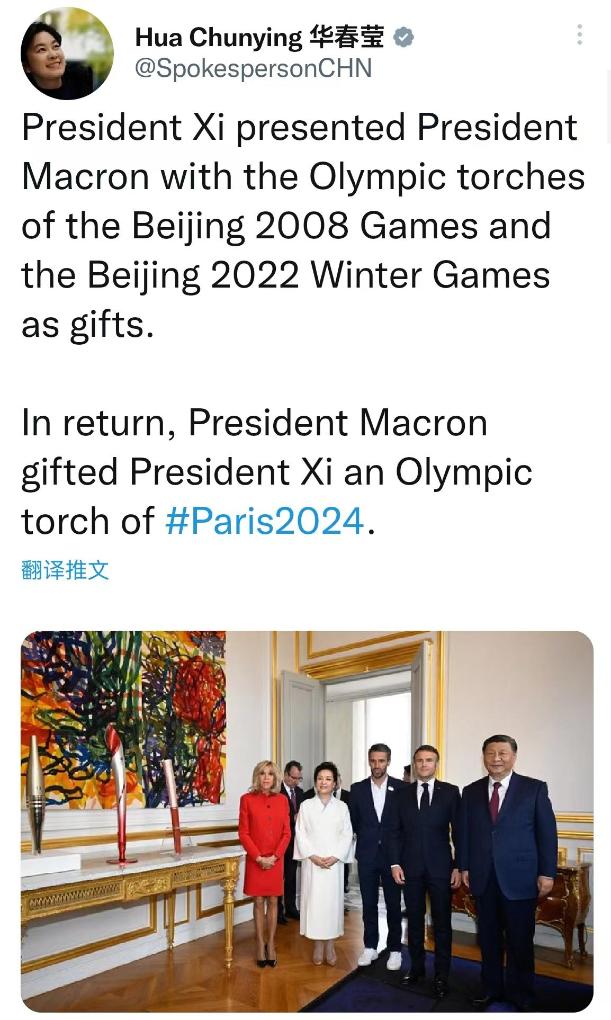 中国外交部部长助理、发言人华春莹在社交媒体平台X上的贴文译文:习近平主席赠送给马克龙总统的是北京双奥火炬,马克龙总统则以巴黎奥运火炬回赠。