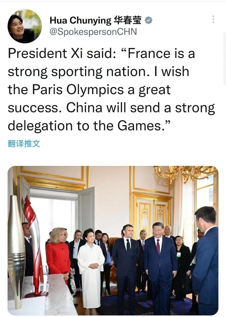 中国外交部部长助理、发言人华春莹在社交媒体平台X上的贴文译文:习近平主席说“法国是一个体育强国,我衷心祝愿巴黎奥运会取得成功。中方将派出高水平代表团赴法参赛。”