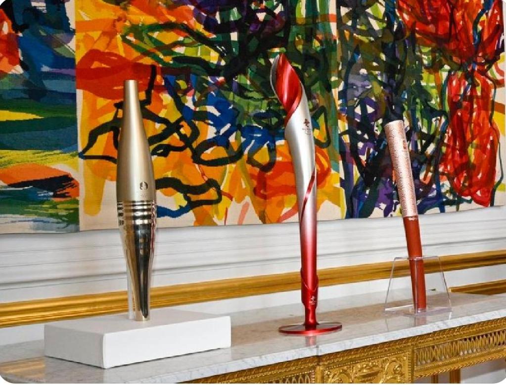 爱丽舍宫一层肖像厅里灯光璀璨,三支奥运火炬在灰白色大理石桌面上并排而立。