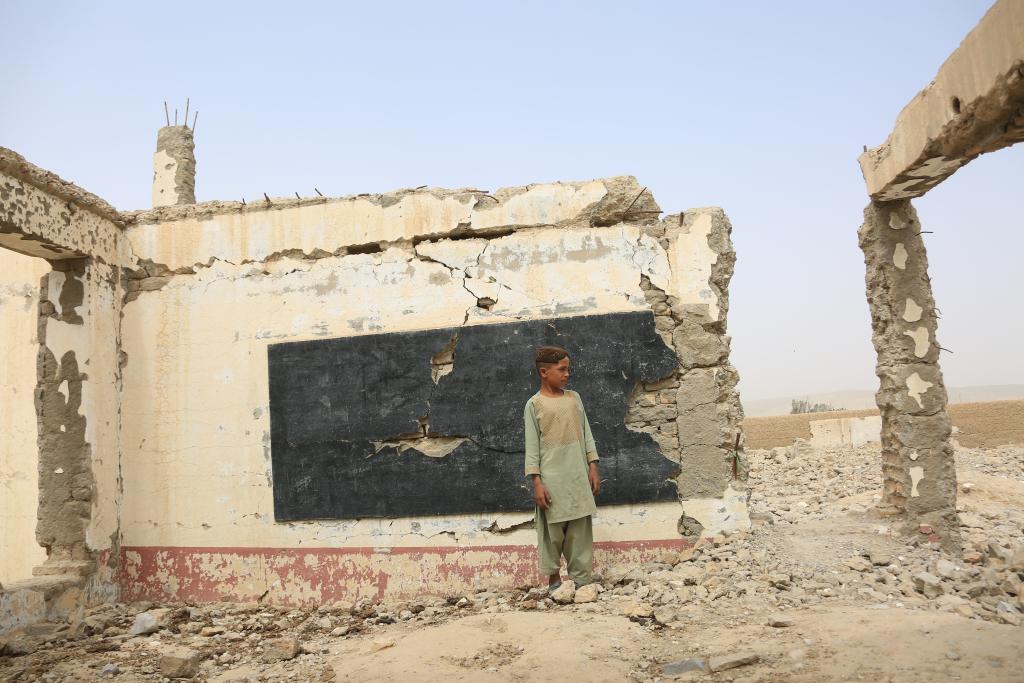 2022年8月23日,在阿富汗南部赫尔曼德省桑金地区,一名男孩站在废墟之中。桑金地区曾经最繁华的市场,如今遍布美军空袭留下的一个个巨大弹坑。新华社发(塞夫拉赫曼·萨菲摄)