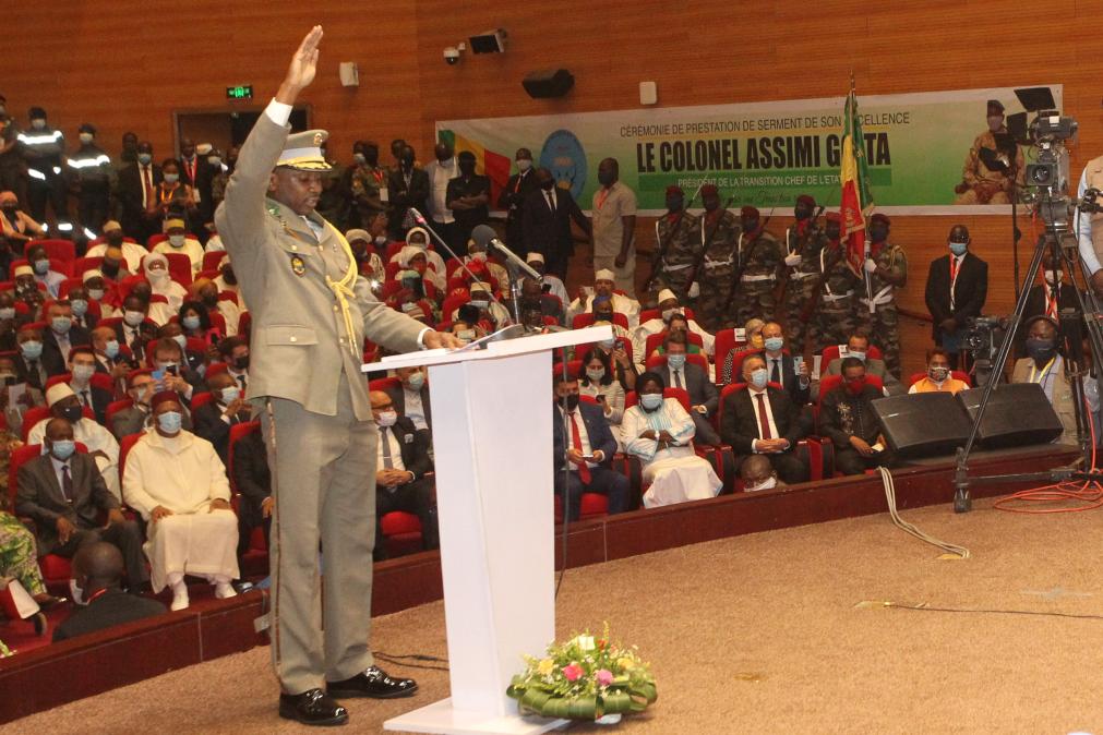 2021年6月7日,阿西米·戈伊塔(前)在马里首都巴马科宣誓就任马里过渡总统。新华社发(哈比卜·库亚特摄)
