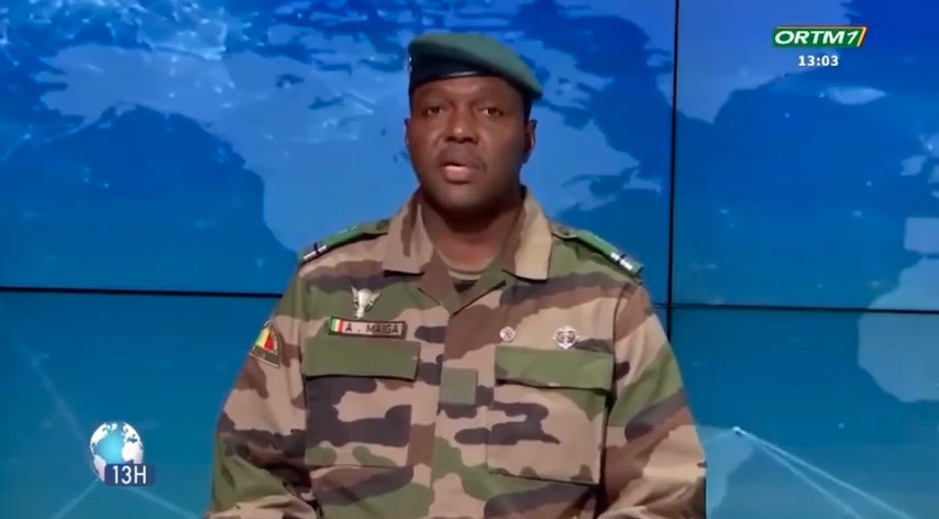 1月28日,马里过渡政府发言人阿卜杜拉耶·马伊加在国家电视台宣读联合公报(视频截图)。西非国家马里、尼日尔、布基纳法索28日发布联合公报,宣布立即退出西非国家经济共同体(西共体)。新华社发