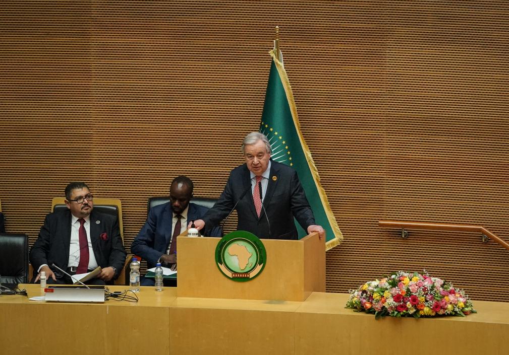 2月15日,在埃塞俄比亚首都亚的斯亚贝巴,联合国秘书长古特雷斯在非盟峰会开幕式上发言。新华社记者韩旭摄