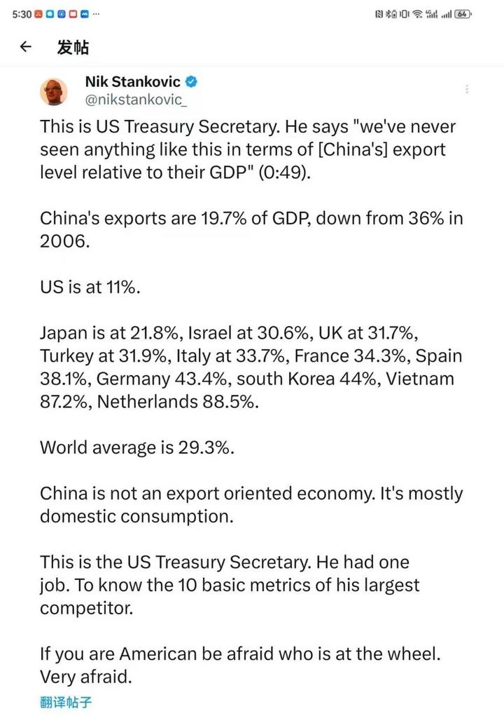 Nik评论说,中国已经不是出口导向型经济体,而是以国内消费为主要驱动力的经济体。“这就是美国的财政部长,他的工作是了解美国最大竞争对手的10个基本指标。让这样的人来管理经济,太危险了。”
