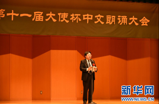 4月29日,在日本东京,中国驻日本大使馆公使衔参赞兼总领事陈巍在第十一届“大使杯”中文朗诵大会上致辞。记者 胡晓格 摄