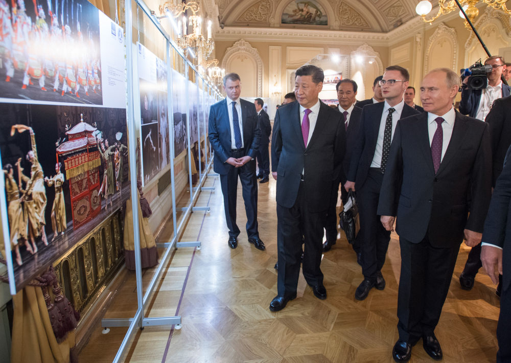 2019年6月5日,国家主席习近平和俄罗斯总统普京在莫斯科大剧院共同出席中俄建交70周年纪念活动。这是两国元首共同参观中俄建交70周年图片展。