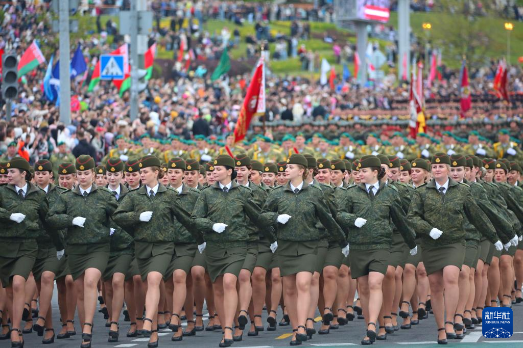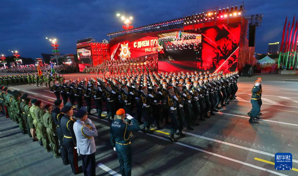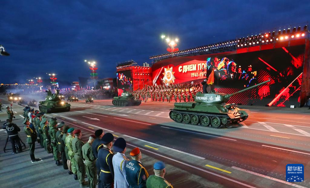 5月9日,在白俄罗斯首都明斯克,军人参加纪念苏联伟大卫国战争胜利80周年阅兵式。新华社发(任科夫摄)