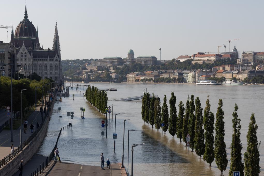 2024年9月19日,在匈牙利首都布达佩斯,人们查看水位上涨的多瑙河。新华社发(弗尔季·奥蒂洛摄)