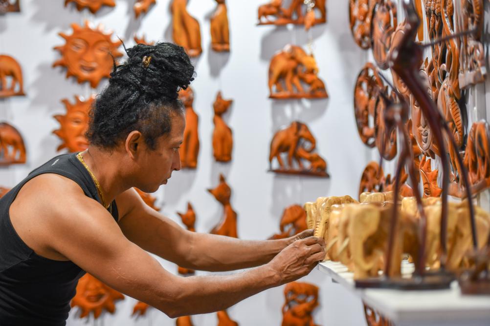 6月18日,来自斯里兰卡的参展商在第9届中国—南亚博览会展区内摆放木雕工艺品。新华社发(彭奕凯摄)