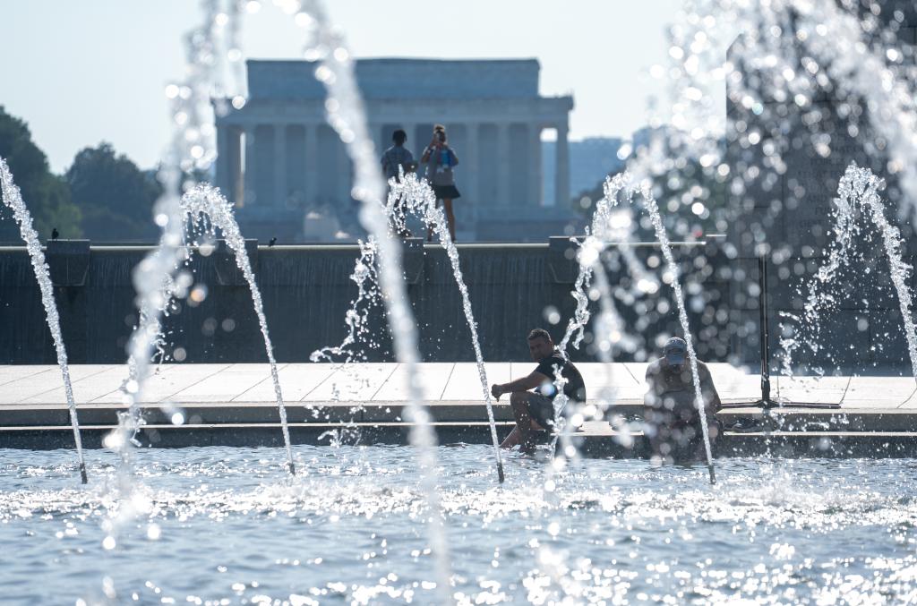2025年6月23日,在美国首都华盛顿,人们在一处喷泉纳凉。新华社记者胡友松摄