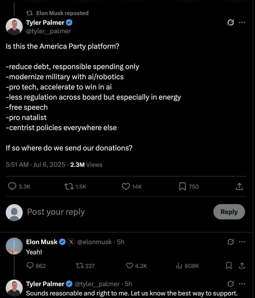 马斯克回复有关“美国党”纲领帖文的截图。
