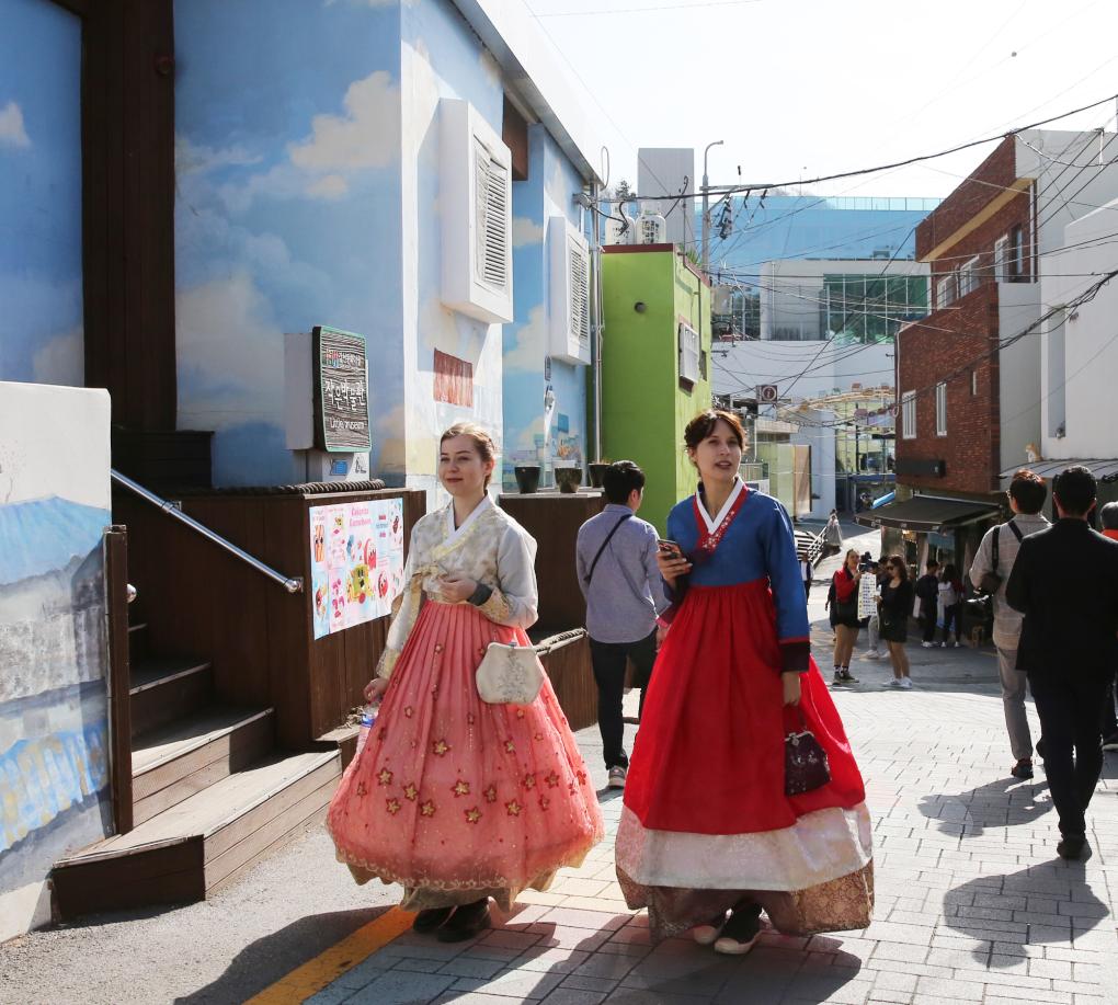 2023年11月9日,游客在韩国釜山市的甘川文化村游玩。新华社记者姚琪琳摄