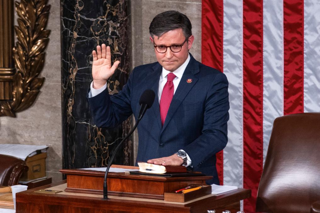 2023年10月25日,在美国华盛顿国会,新当选的众议院议长迈克·约翰逊宣誓就职。新华社发(亚伦摄)