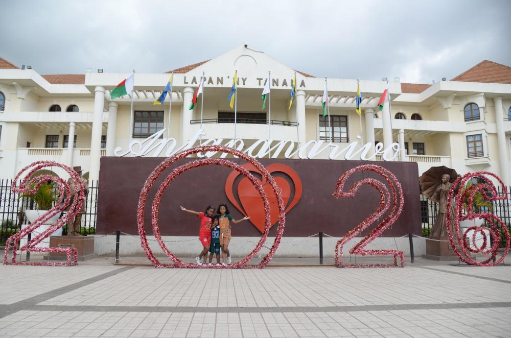 2025年12月31日,人们在马达加斯加首都塔那那利佛市政厅前合影,迎接2026年新年的到来。