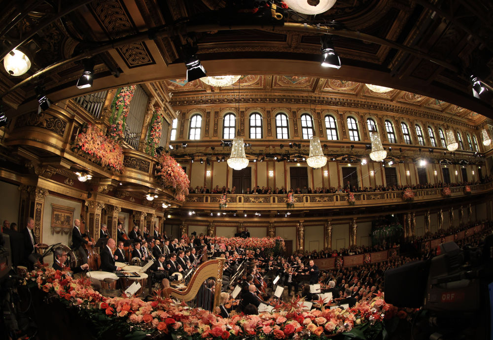 2026年1月1日,维也纳爱乐乐团成员在奥地利首都维也纳金色大厅举行的新年音乐会上演奏。